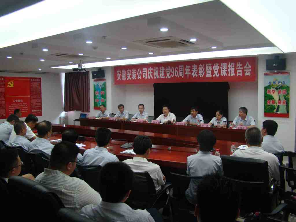 6月29日下午,安徽安裝公司召開慶祝建黨96周年表彰大會(huì)暨“七一”專題黨課活動(dòng),公司領(lǐng)導(dǎo)班子、在肥在崗黨員、入黨積極分子以及受表彰的先進(jìn)集體、先進(jìn)個(gè)人等60余人參加了會(huì)議。會(huì)議由公司董事長(zhǎng)、總經(jīng)理、黨委副書記王軍邦主持。