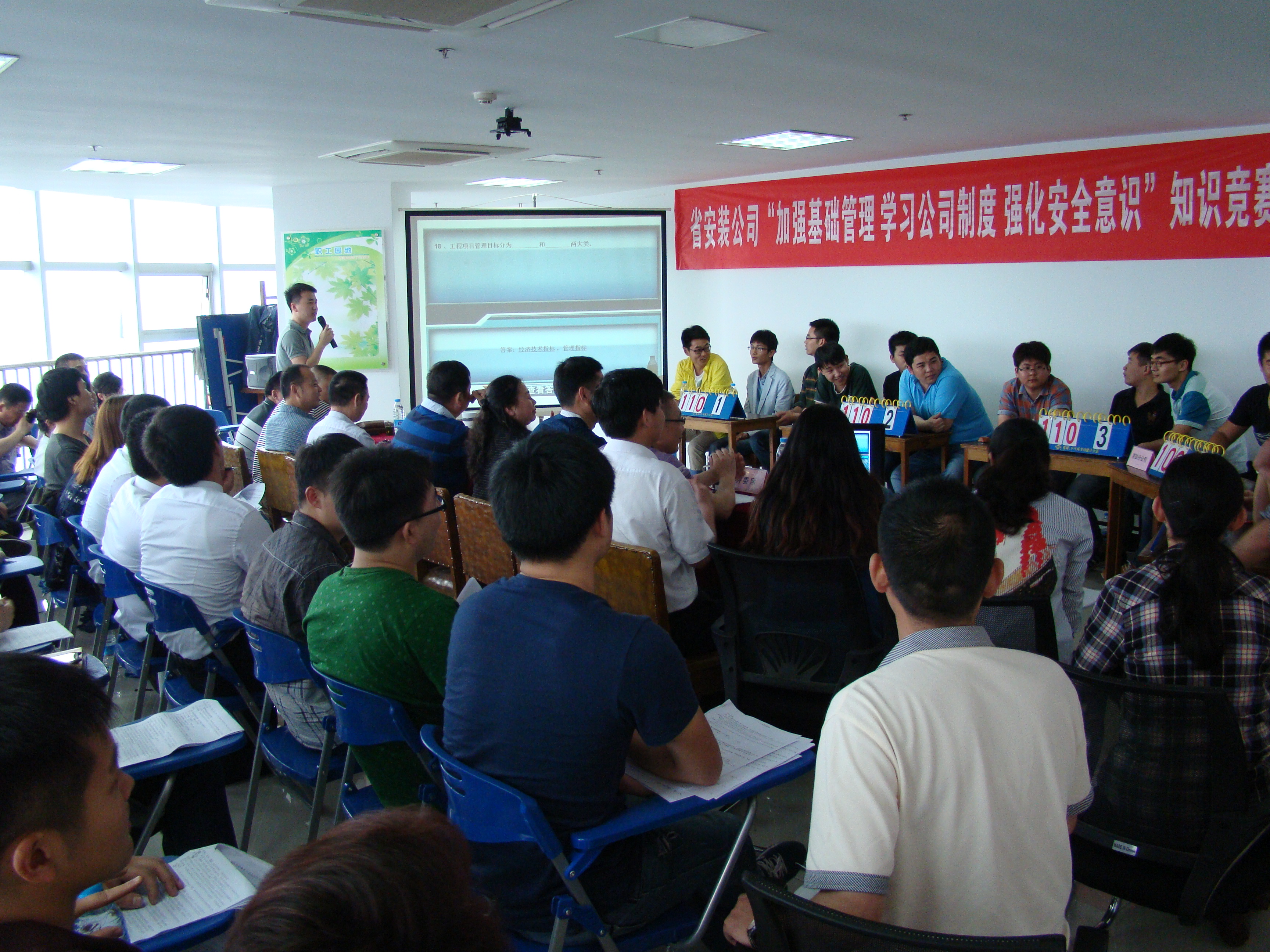 為了充分展現(xiàn)職工積極好學(xué)的精神風(fēng)貌,促進(jìn)職工掌握企業(yè)制度和專業(yè)知識,激勵大家不斷學(xué)習(xí)、不斷進(jìn)步。5月15日下午,公司在職工之家舉辦了“加強(qiáng)基礎(chǔ)管理、學(xué)習(xí)公司制度、強(qiáng)化安全意識”知識競賽。公司董事長、總經(jīng)理王軍邦,黨委副書記、紀(jì)委書記胡六中,工會主席李原到現(xiàn)場觀看比賽,并為選手們鼓勁加油。