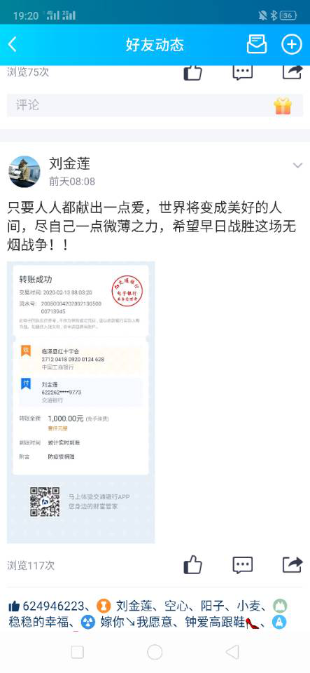 2020年2月13日,劉金蓮?fù)就ㄟ^微信轉(zhuǎn)賬的方式轉(zhuǎn)給甘肅省臨澤縣紅十字會捐款人民幣1000元,然后她又主動聯(lián)系當(dāng)?shù)丶t十字會工作人員要求擔(dān)當(dāng)志愿者,但是因為客觀原因未被批準(zhǔn)。