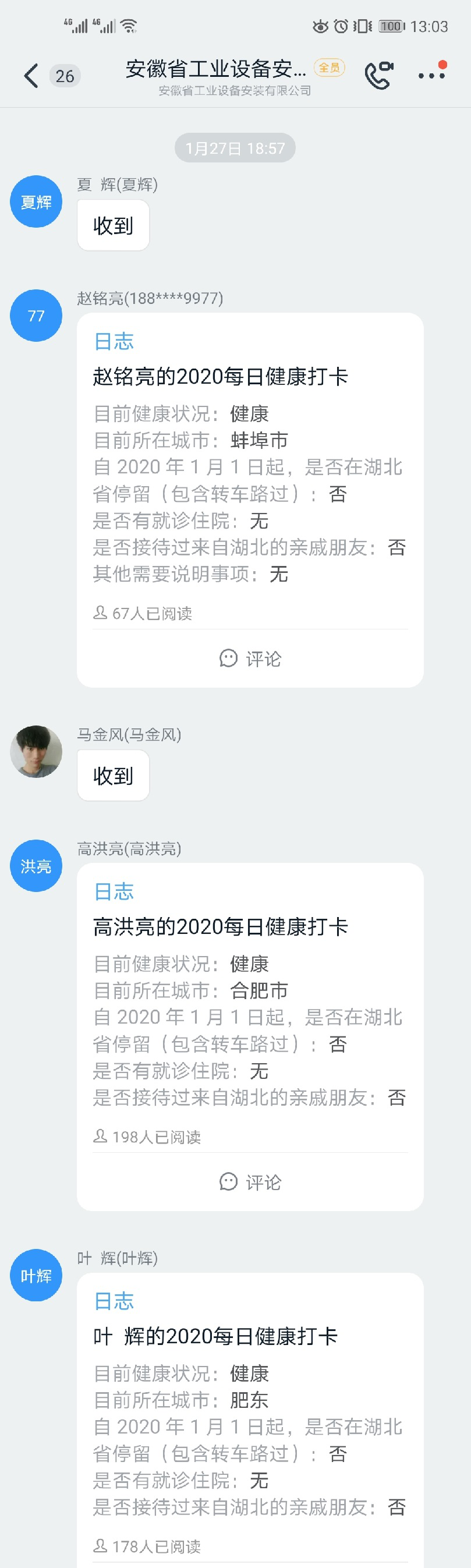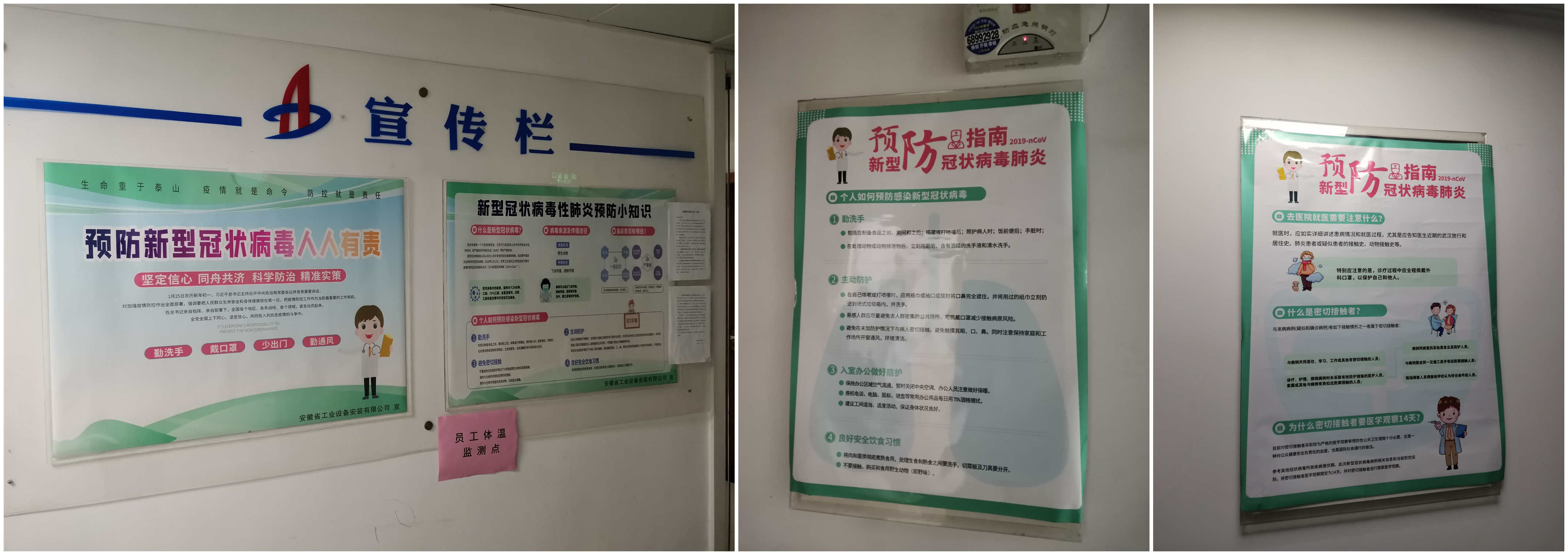 1月27日(大年初三),公司下發(fā)《安徽安裝公司關(guān)于做好新型冠狀病毒肺炎疫情工作的防控措施》,全體員工每日在釘釘日志專項報告當(dāng)日去向及身體狀況,各分公司、各部門認(rèn)真做好登記,確保信息及時準(zhǔn)確,時刻密切關(guān)注員工的身體健康狀況。