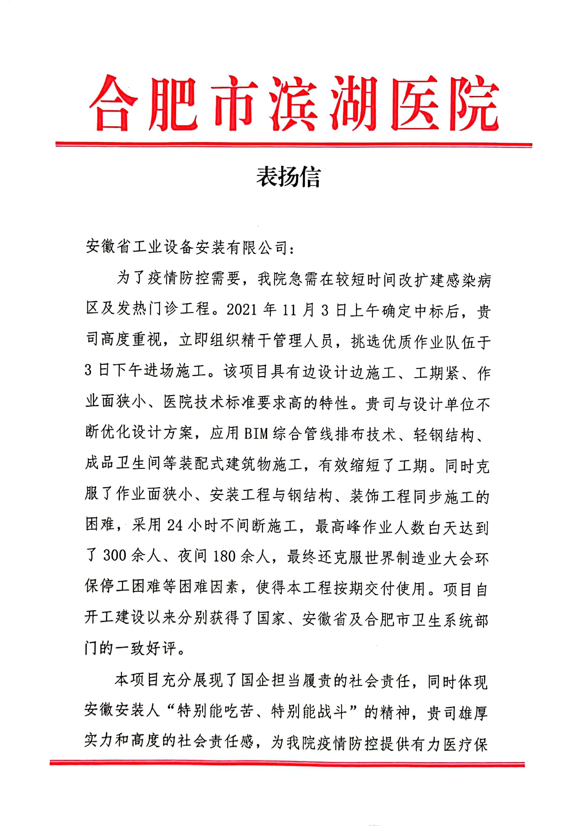 近日,安徽安裝公司收到合肥市濱湖醫(yī)院表揚信,信中高度贊揚公司濱湖醫(yī)院感染病區(qū)及發(fā)熱門診應急改造工程設計施工一體化方艙醫(yī)院項目克服重重困難,縮短工期,一個月的時間內(nèi)按期交付使用。該項目充分展現(xiàn)了安徽安裝作為國有企業(yè)擔當履責的社會責任,為合肥市打贏防疫攻堅戰(zhàn)奠定了堅實基礎。