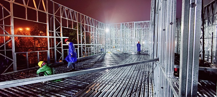 自11月初接到項(xiàng)目任務(wù)以來,面對(duì)一個(gè)月完成三層結(jié)構(gòu)方艙醫(yī)院主體機(jī)構(gòu)、內(nèi)部安裝、室外裝飾的極限工期,安徽安裝公司高度重視、精心組織、科學(xué)安排、迎難而上,全力以赴加快工程建設(shè),期間,公司領(lǐng)導(dǎo)多次前往項(xiàng)目現(xiàn)場(chǎng)幫助協(xié)調(diào)解決工程施工中的難點(diǎn)、困難,為項(xiàng)目人員鼓勁加油;公司相關(guān)部門負(fù)責(zé)人駐扎項(xiàng)目一線,指導(dǎo)協(xié)調(diào)內(nèi)部流程、現(xiàn)場(chǎng)施工、外部對(duì)接、質(zhì)量安全等一應(yīng)事務(wù);分公司第一時(shí)間組織精干力量進(jìn)入項(xiàng)目現(xiàn)場(chǎng),梳理現(xiàn)場(chǎng)情況,核對(duì)圖紙清單,進(jìn)行施工準(zhǔn)備。從公司領(lǐng)導(dǎo)到項(xiàng)目一線,安徽安裝公司自上而下以高度的使命感和責(zé)任感,投入到緊張的工程建設(shè)中去。項(xiàng)目管理人員披星戴月,從早上到夜間駐守在項(xiàng)目一線,每日召開工程會(huì)議,討論施工工作進(jìn)展,制定下一步工作計(jì)劃,安排交叉作業(yè)工序。為保障夜間施工安全,項(xiàng)目部安排兩名安全員輪流值守項(xiàng)目現(xiàn)場(chǎng),夜間在項(xiàng)目現(xiàn)場(chǎng)不斷巡查確保施工安全、高效開展。