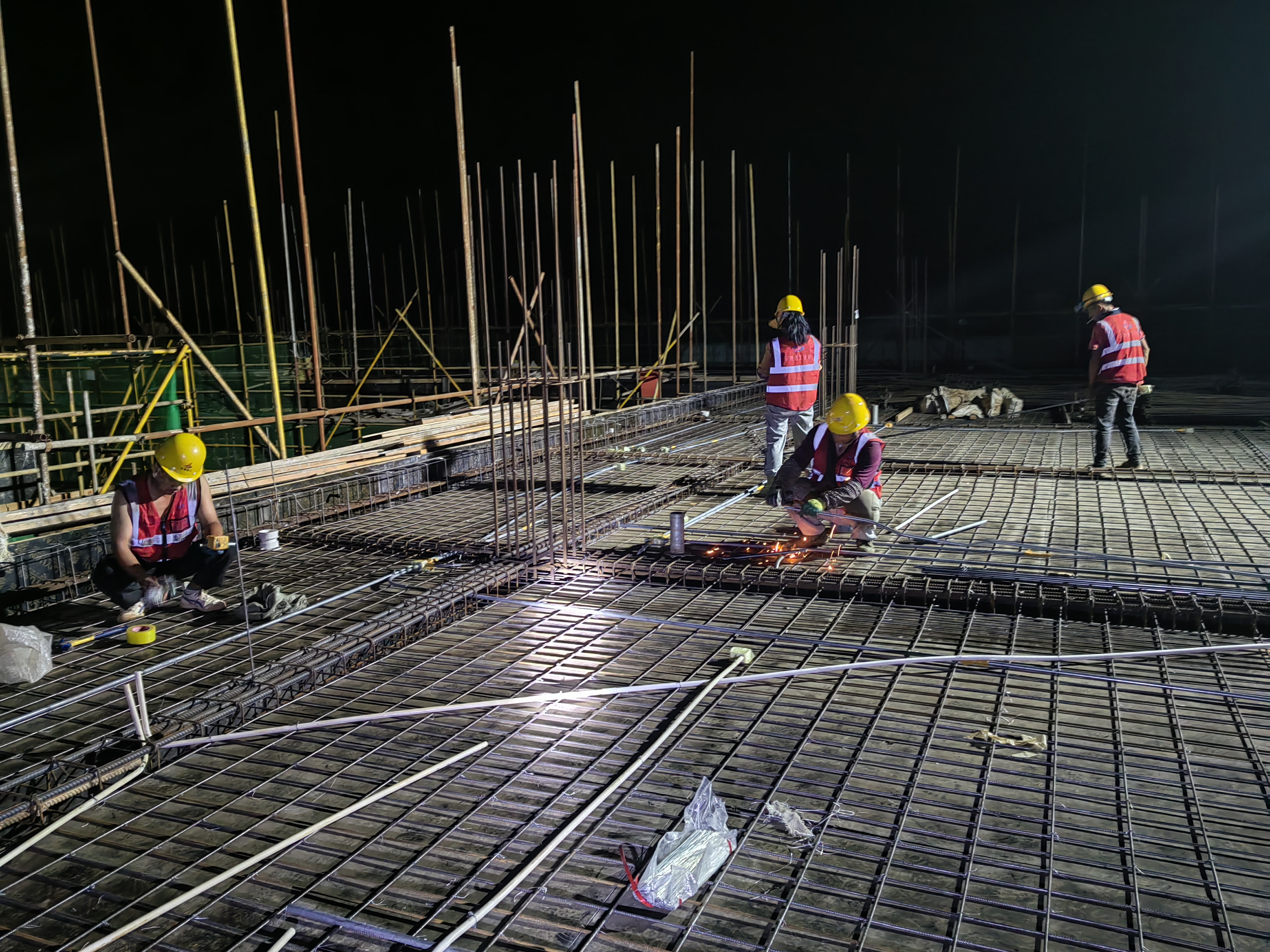 工人加班加點(diǎn)進(jìn)行水電線管布置